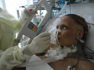 Fazia seis horas de hemodiálise por dia, perdi meu cabelo e aos poucos ficava livre do respirador. Havia grandes feridas abertas no meu abdome, sem perspectiva de fechar e todos os dias eram buscados métodos de drenagem e cicatrização. Fui para um CTI semi-intensivo onde minha família pode passar mais tempo e o Renato dormia comigo, o que me ajudou muito, muito mesmo.